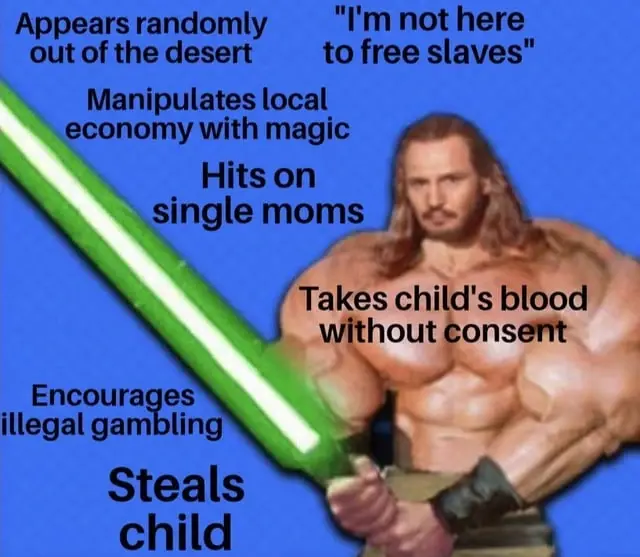 I love how Obi-Wan suggests that they just throw a few card games using the Force to pay for their engine, and Qui-Gon’s response is basically, “No, that wouldn’t be right. We need to put a child in danger so he can throw a race with the Force.”
