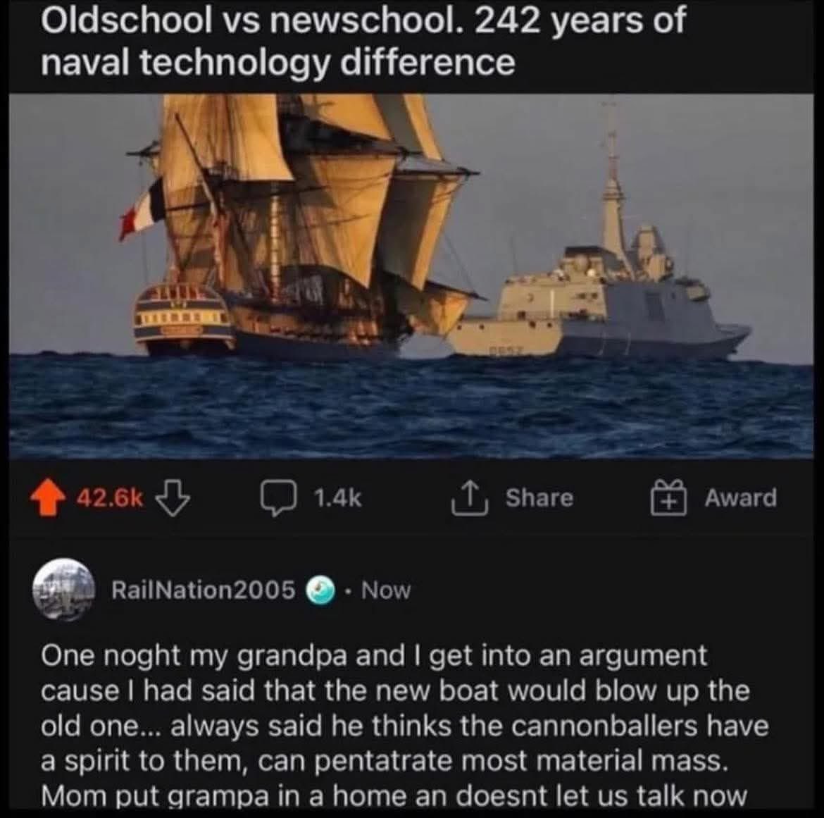 We did a gun shoot on a wooden built raft with .50 cals and M16s. It was harder than expected to sink the raft. I would say a cannon ball would do massive damage but today’s ships can move quicker. So ultimately the newer ships would more than likely win.