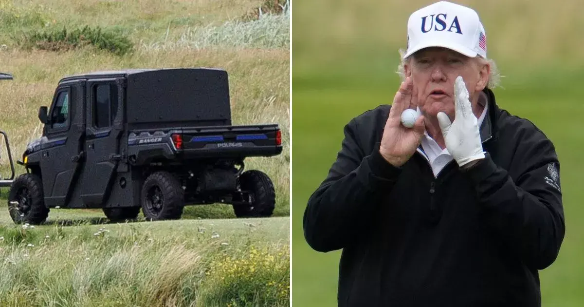 The buggy wasn’t driven by Trump, but is thought to be his “getaway vehicle” should anyone open fire on the course. The black, obviously armored vehicle followed Trump around as he played golf, with many experts noting that it bore similarities to “The Beast” — Trump’s protective vehicle stateside.