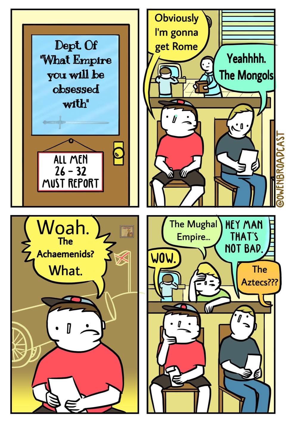 Mongol guy’s font change has been living in my head all afternoon. Why is it only him? Why does getting the Mongol empire make him start speaking in a Charles-Rennie-Mackintosh-looking font? Like, the artist obviously likes to play it loose with typefaces in the rest of the comic too, but this one guy seems like the centre of the typographical attention and I do not understand the choices made