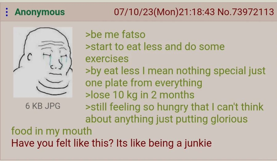 arrow-up1411arrow-down1imageAnon goes on a dietsh.itjust.works🍹Early to RISA 🧉@sh.itjust.worksM to Greentext@sh.itjust.works · 4 months agomessage-square75fedilink