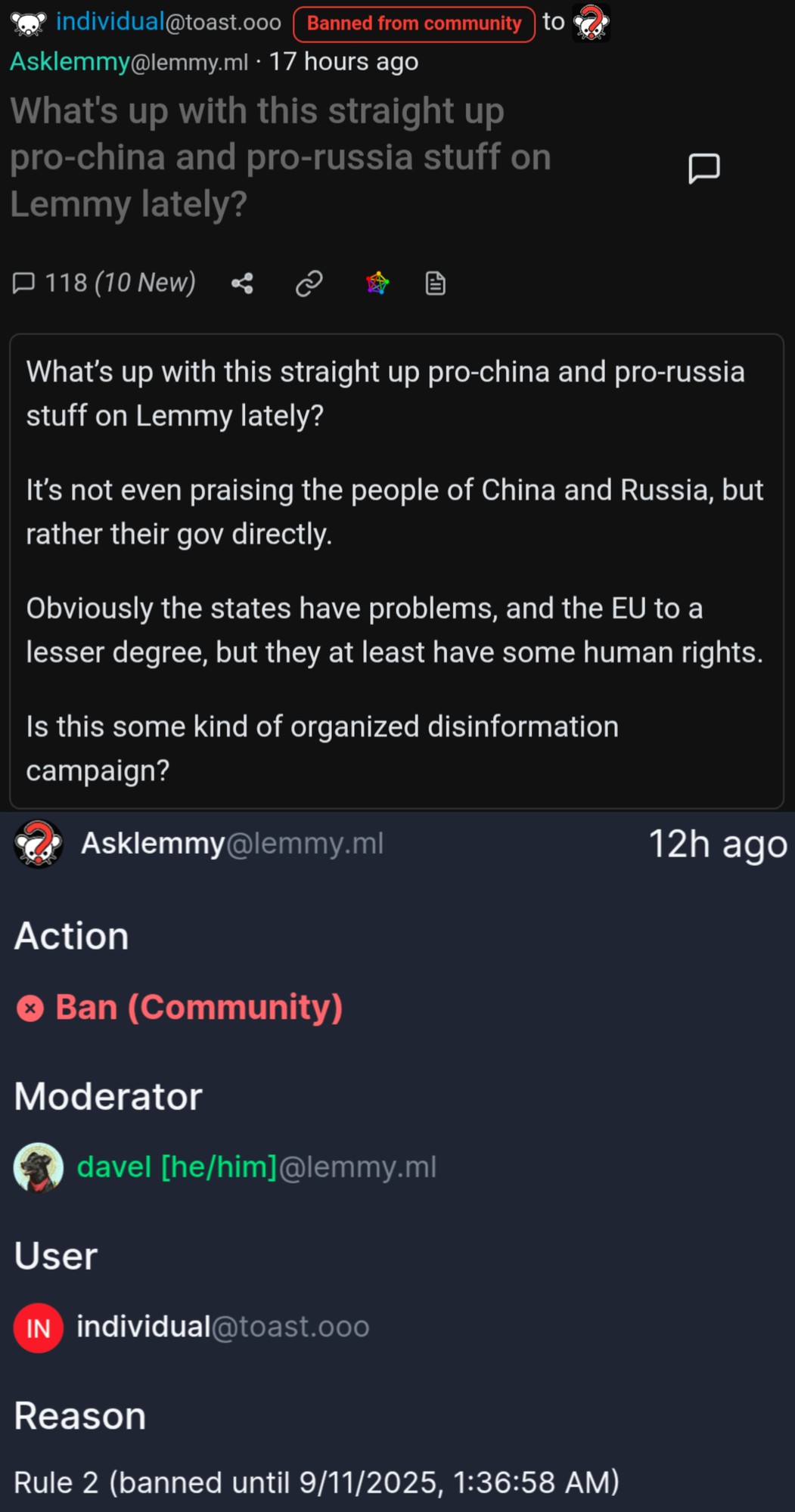 Modlog https://photon.lemmy.world/modlog?=&community=38&user=16371737
