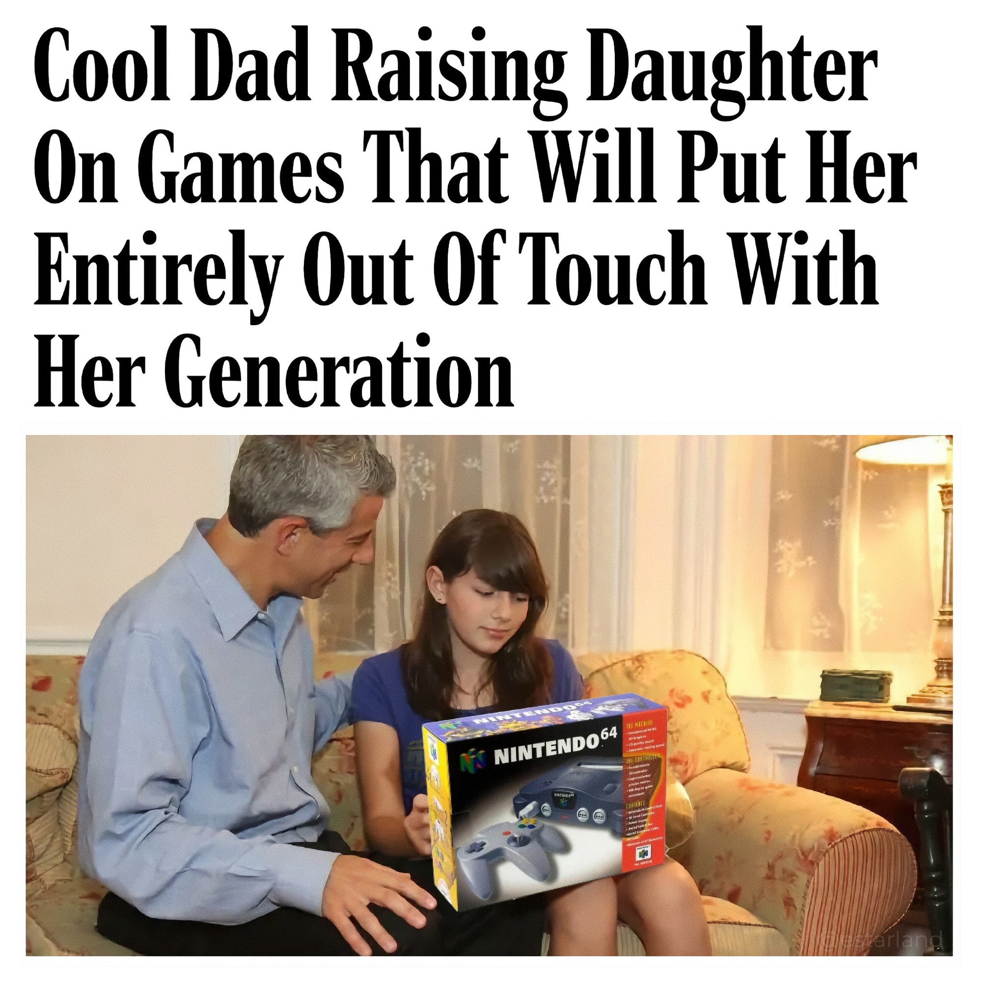 Yeah, if she plays an N64, she won’t be exposed to any popular series from today, and will instead play things like Mario Kart, The Legend of Zelda, Donkey Kong, Smash Bros., and Pokémon.