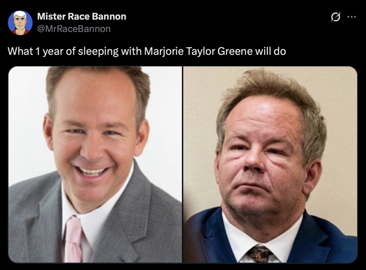 Like this is clearly a filtered photo vs an unfiltered photo. If you showed this to a neutral or someone on the right and said, “haha see how MTG ruins her husband”, you would be giving them ammo to discredit you in future conversations because they know for a fact you are being dishonest here.