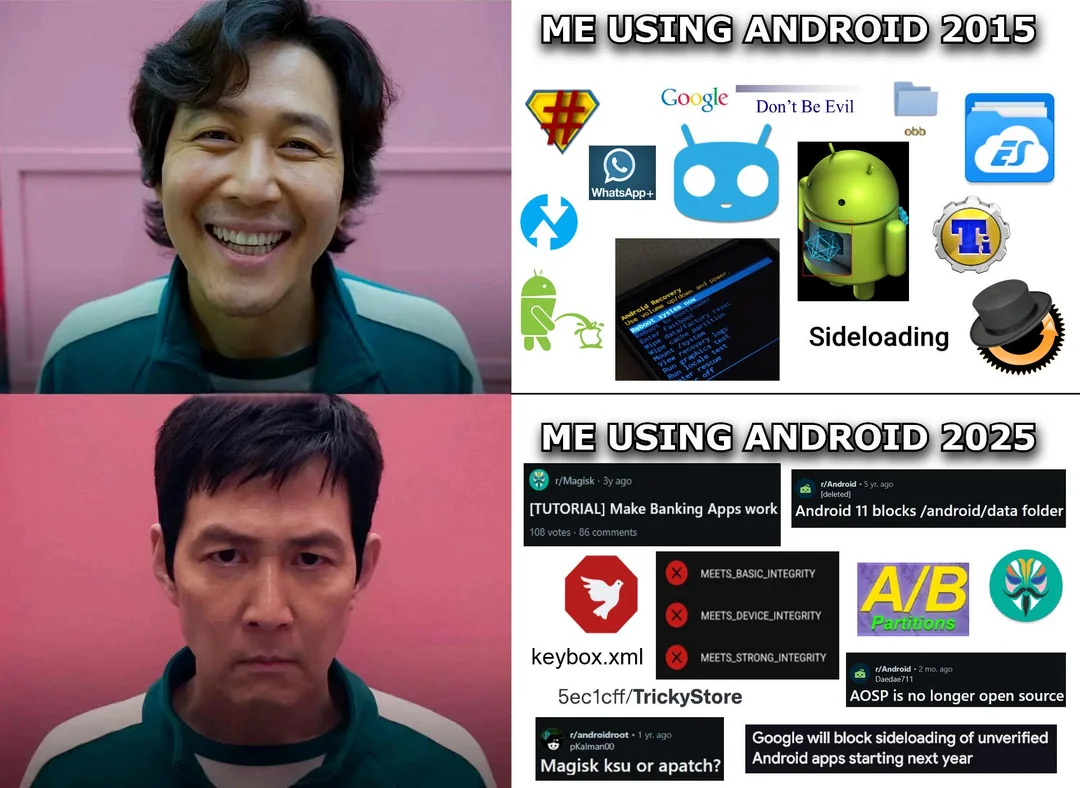 minus-squareOwl@mander.xyzlinkfedilinkarrow-up7·2 months agoWait what ? Side loading blocked Well it was a good run, time to look into custom roms…