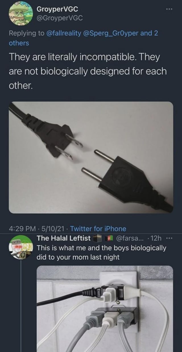 The prongs on my appliances making me think about gay sex then turning that into a point on how it’s against gods will is level 1000 repression.