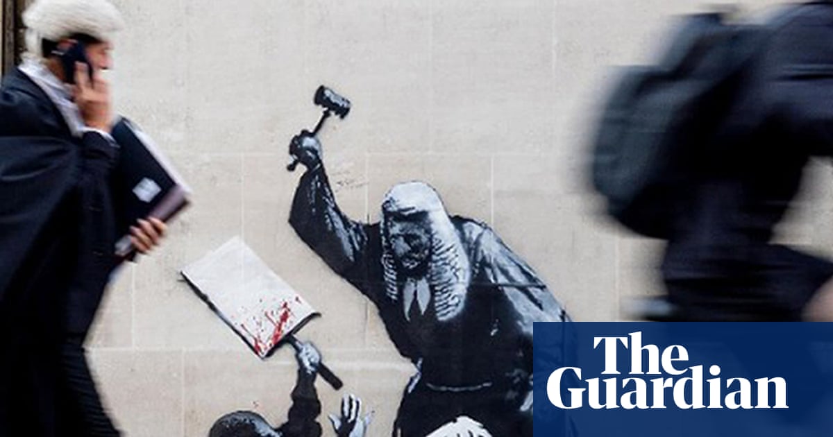 A painting by Banksy of a judge using a gavel to beat a helpless protester appeared on the walls of the Royal Courts of Justice before quickly being covered up by guards.
