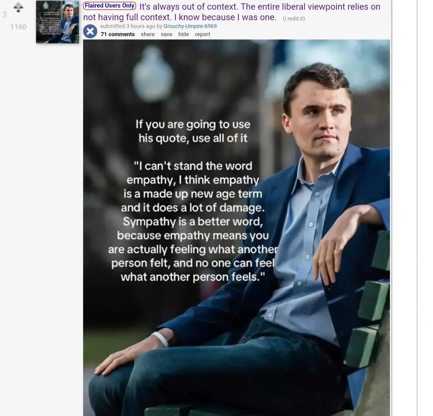 That is why the right hatesthe concept of empathy. A) It means that their experience and viewpoint is not objective. B) It means that they are expected to practice seeing others as individuals in whole, not as charactictures and stereotypes. C) It means that they are faced with the realities of bias, bigotry, privilege, and systemic racism that does exist and is experienced by everyone differently. And D) It means that their gut reactions, their inherent feelings of fear, disgust, anger, and hatred at those different to themselves needs to be challenged and seen for the bigotry it is.