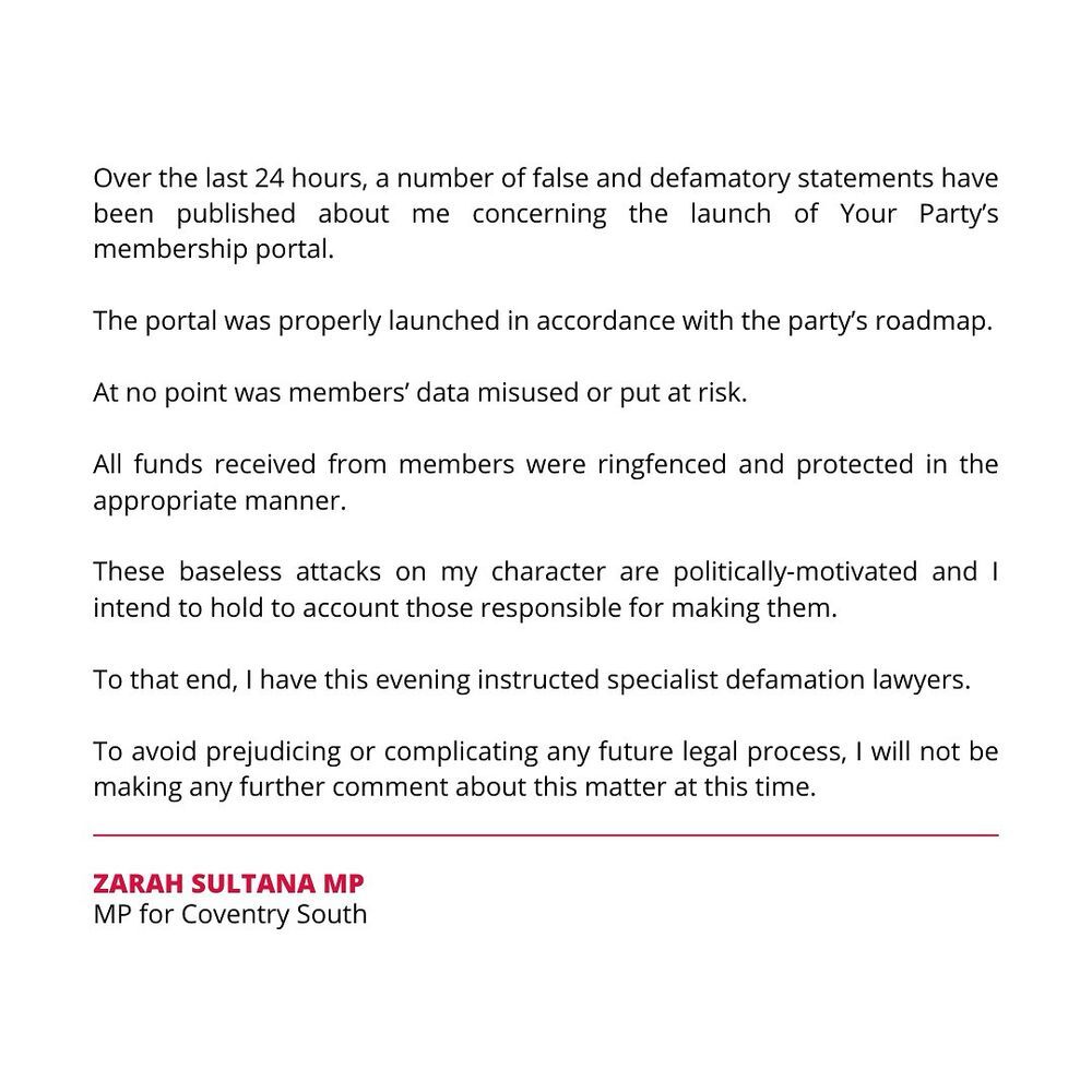 Over the last 24 hours, a number of false and defamatory statements have been published about me concerning the launch of Your Party’s membership portal.
