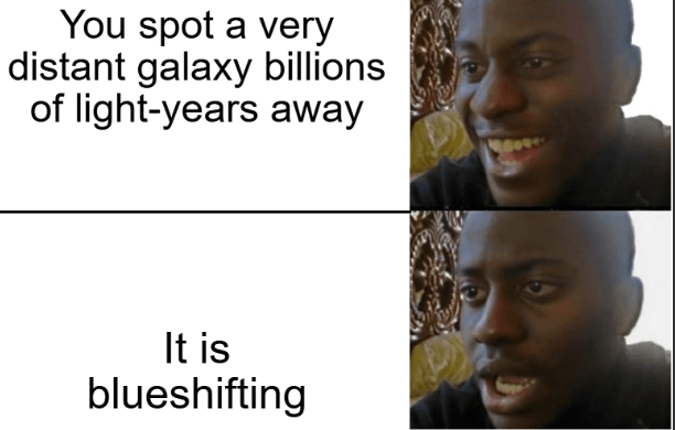I was going to argue with this too, but the meme says blueshifting, not blueshifted. They’re right, but mostly because the meme is probably written poorly. Maybe they meant it’s accelerating toward us though. Idk.