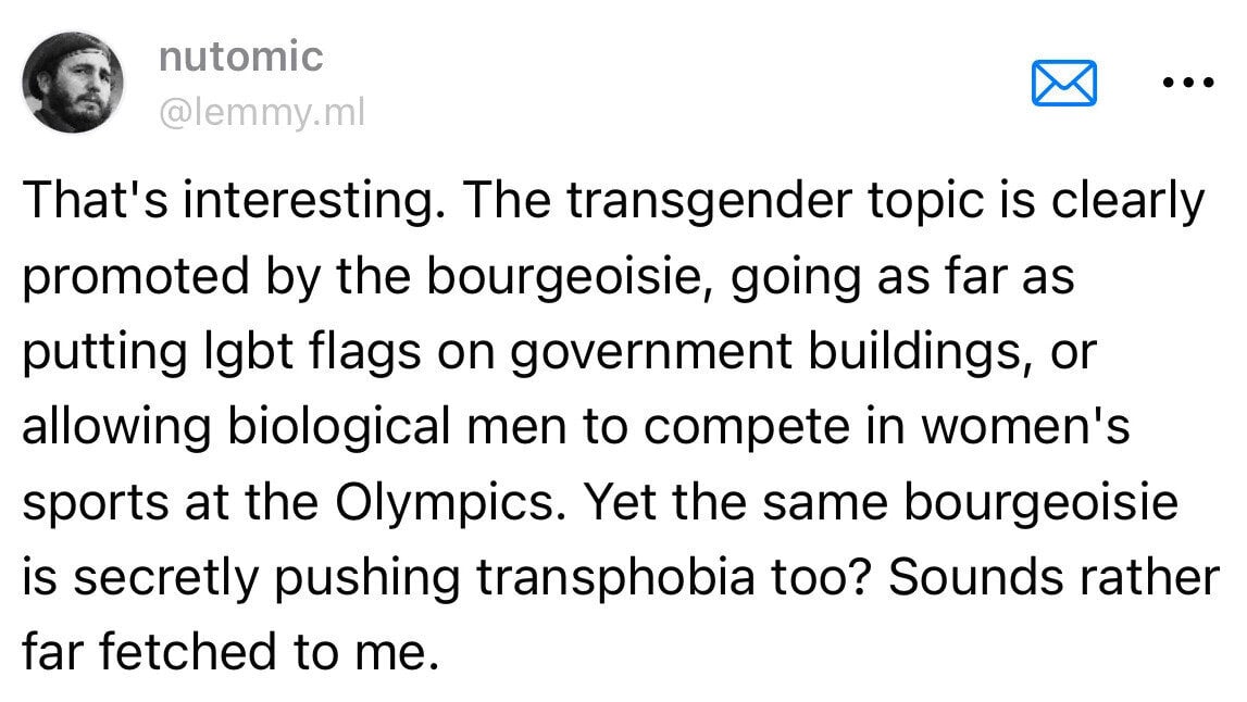 Transphobia is a deal breaker for a substantial portion of the lemmy userbase. Also, other open-source communities are fiercely pro-trans, like Debian. And Ubuntu recently chastised mods for pushing the idea that transness is inappropriate for bios, supposedly because it is seen as sex-related. In this interval you say “nothing new happened”, this probably means that the person is question is at least as transphobic as they were back then. If you consider transphobes only get more and more radicalized (Rowling, Chapelle, Mace, etc), it can only be expected to get worse, so that is why I said “at least”. If he ceased to be a transphobe I suppose he would be out telling everybody, perhaps add a changelog that pronouns are canonically supported in ML. In the meantime, genocidal anti-trans rhetoric and legislation has only gotten worse, rendering his previous standing on the issue, even if stable, relatively worse from an ethical viewpoint, and if trans people under the new circumstances are more suspicious and feel less safe in the instance, they are fully justified, taking all the above into consideration. Being “as antisemitic as before” for an individual between 1938 and 1942 does not mean the same amount of antisemitism. The amount of things done to us in the surrounding environment has severely worsened, so being on the same ideological position comes with condoning a lot more cruelty against us. Because this is a prejudice and the “amount” of prejudice does not really matter when not only genocidal rhetoric is heightened, but also because right-fucking-now there is all this talk about cracking down on trans online spaces as havens of extremism. If the rest of this comment has not persuaded you yet, then this last part should be an eye opener, because being a fediverse instance admin, in this toxic social climate of intense transphobia is reason right enough for any trans people in ML to pull a reddit-exodus on them. So, yes, keeping the issue afloat is perfectly justified in my view.