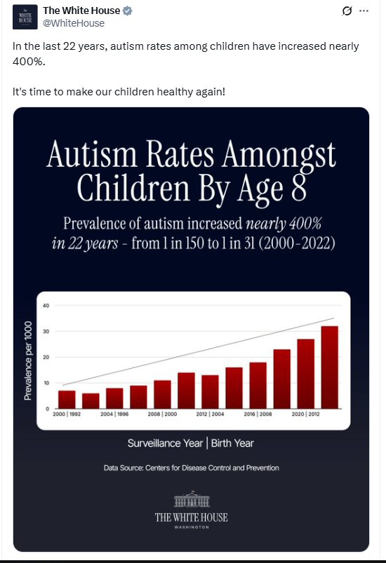 The graph says that there has been a 400% increase in the prevalence of autism. That’s not true, and is unsupported by the evidence. There has been a marked increase in the effective diagnosis and therapeutic interventions, but autism was largely undiagnosed and under-reported for almost all of human history. We’re still improving and refining the diagnostic criteria, and any changes in the number of cases should not be suggested to support any causal relationship with anything.