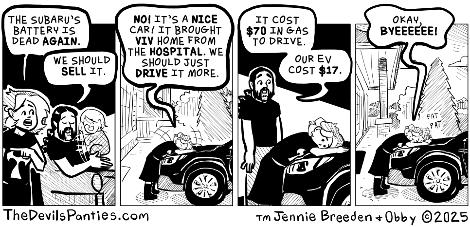 There have been regular signs of getting rid of their gas car. Their cras have shown up between her first car which she had painted all kinds of things all over and I think someone bought it for that. At one point I think they had two cars and one was a hybrid but they got the electric used and I think the subaru was the family thing but they don’t need all the things they did with a baby and toddler as opposed to I think one coming out of toddlerhood and the other going to young adult. I guess the big question is will they go for a used electric like before or a new one or just stop having two cars. I think were they live does not need a car as much so its possible they can go univehicle. I mean the comic suggests they use it so little the battery got to low.