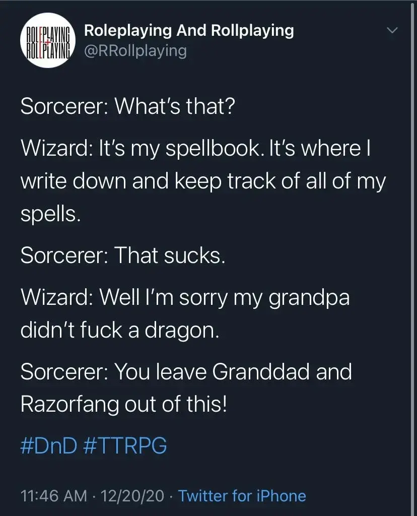arrow-up1353arrow-down1imageThe Wizard and Sorcerer beef continueslemmy.dbzer0.comStamets@lemmy.dbzer0.com to RPGMemes @ttrpg.network · 25 days agomessage-square9fedilink