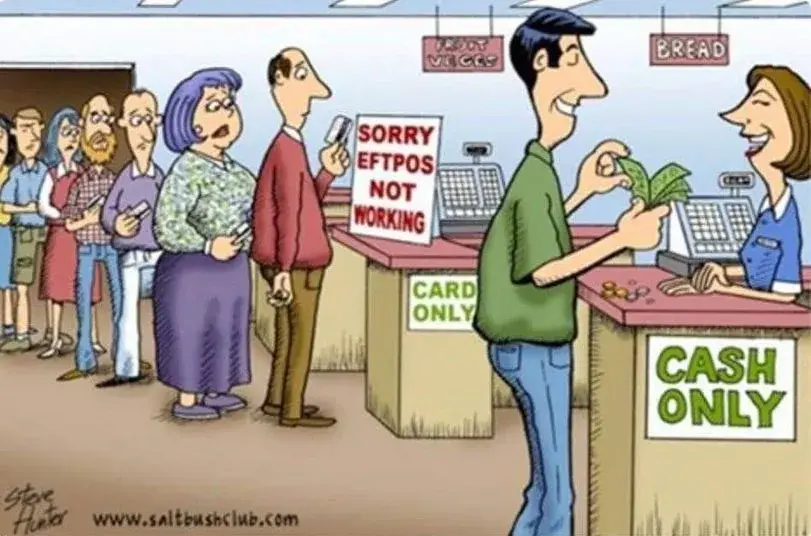 I honestly don’t remember the last time this was an issue where I live (other than stores not taking cards at all). That said I do carry a couple hundreds bucks worth of local currency just in case. Also, let’s fuckin finally switch our electronic payments to Taler which can fallback to working offline (but with less scam protection for vendors).
