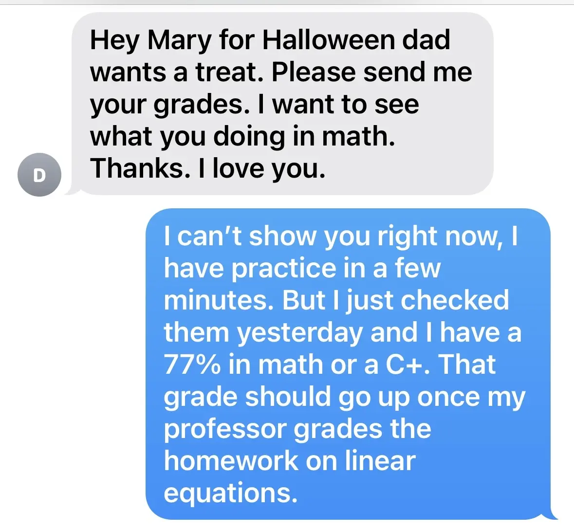 Ok, but wtf is this thing your mom texted you “Dad wants a treat, send me your grades?”