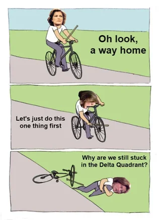 Caption: “The Delta Quadrant is so hostile! Why is it so hard to get home?!”