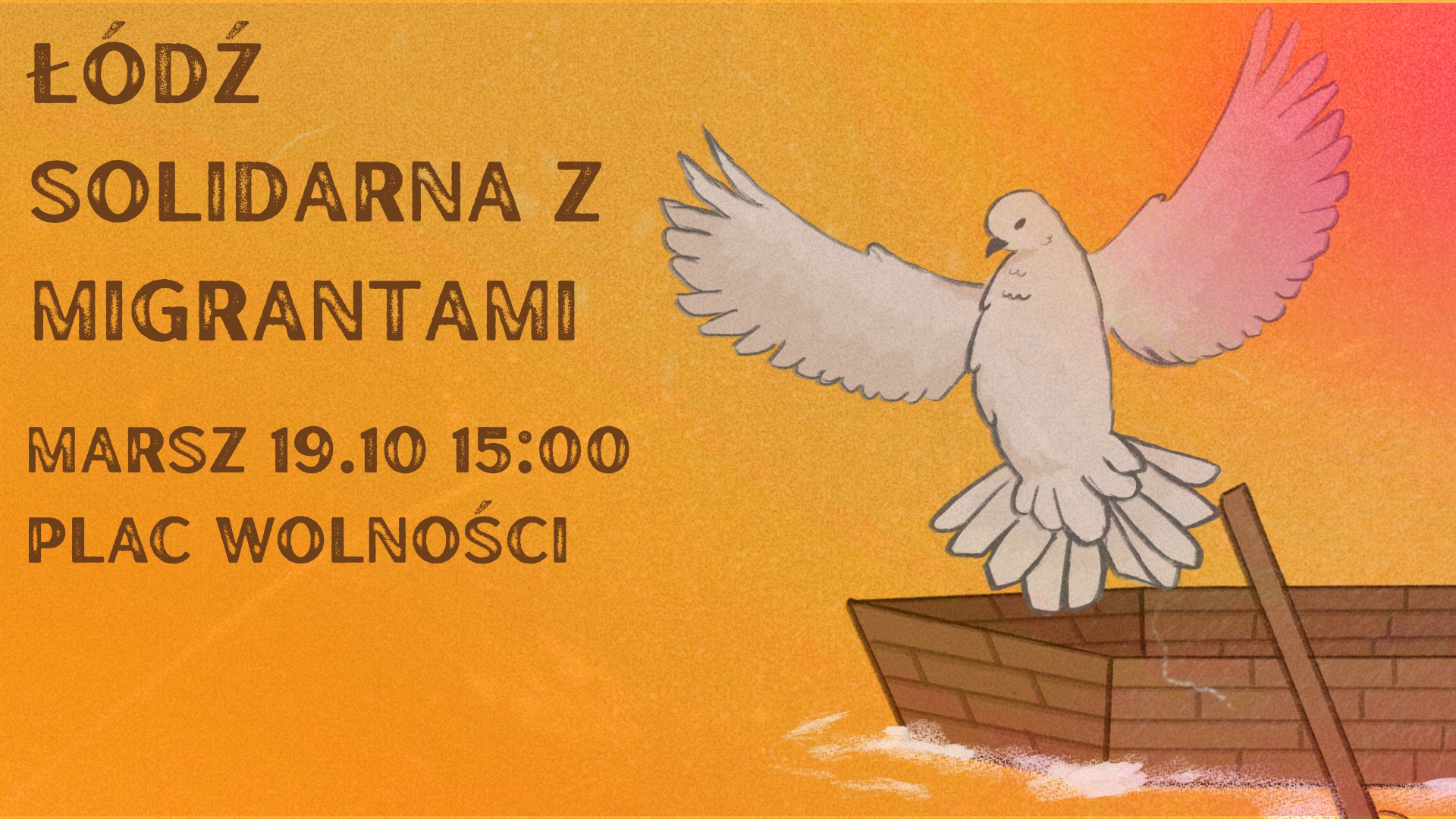 Tekst alternatywny: Grafika promująca marsz “Łódź solidarna z migrantami”. Po prawej stronie ilustracja przedstawiająca białego gołębia wylatujący z łodzi wiosłowej płynącej przez wzburzone morze. Tło grafiki stanowi gradient kolorów od różowego po żółty. Po lewej stronie znajdują się informacje związane z wydarzeniem. Data: 19.10.2025; godzina: 15:00; miejsce rozpoczęcia marszu: Plac Wolności.
