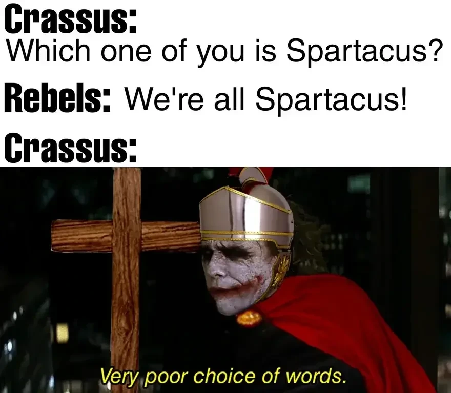 the resulting prisoners taken by the Roman forces were offered a reward if one of them would point out their leader, Spartacus. None of them did.