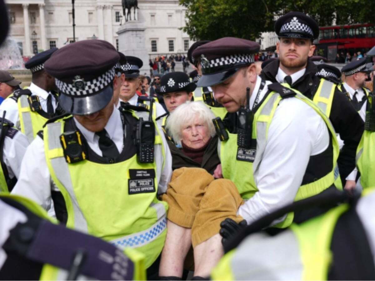 The police arrested many elderly people and disabled people during the protest. This included a blind man using a mobility cane and two mobility wheelchair users. Everyone held a sign with the same seven words: