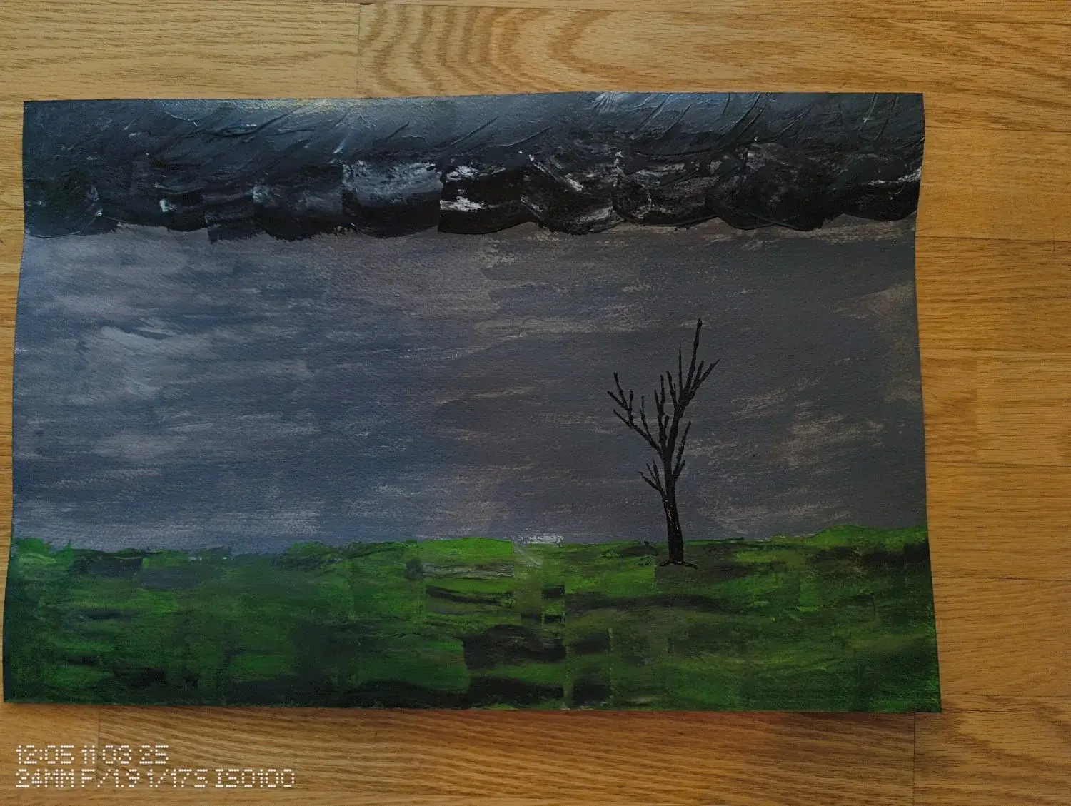 This was done with acrylic paint, paint brush, metal package strapping edge, and a toothpick.